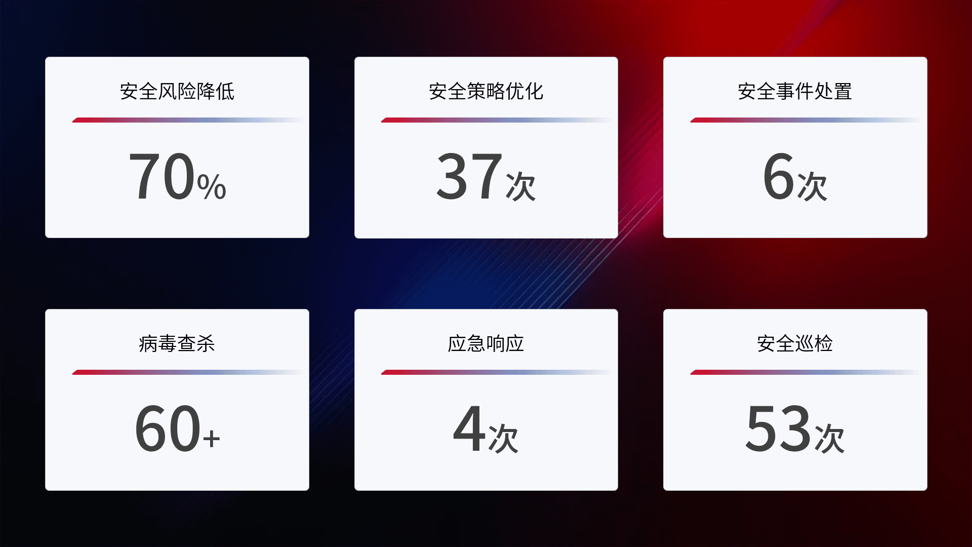 提供全面的安全事件报告体系,,,,包括处置报告、、、周报、、、、季度和年度总结,,,,结合持续监控,,,,帮助客户深入了解网络安全状况。。。